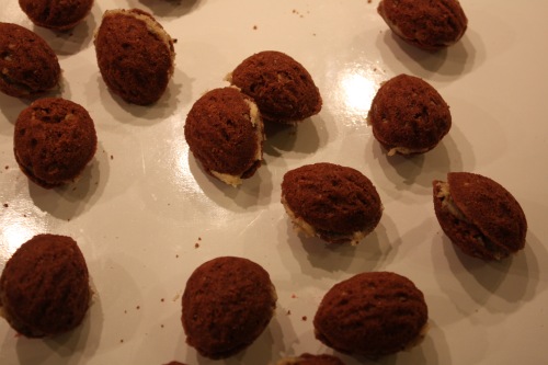 Smíchejte ingredience na náplň a lepte k sobě půlky ořechů. Uchovávejte v chladu.