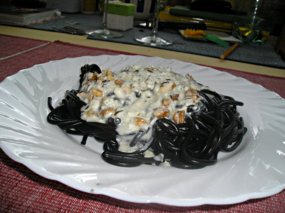 Na našem ilustračním obrázku jsme právě zkoušeli špagety obarvené sépiovým inkoustem. Většinou jsme se dozvěděli, že to vypadá jako červi ;) Při vaření to smrdí jako když vaříte ryby, ale chuťově jsou nakonec stejné jako obyčejné žlutobílé těstoviny. Ovšem cenově je to trochu jinde, cca 100 Kč za balíček špaget, takže když už, doporučuji nechat pro nějakou zvláštní příležitost (děsení návštěv omáčkou s červy ;)